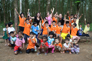 On Monday, November 21, 2011, Yvette, Iris and Stefanie have started their last week as teaching volunteers in the Kuraburi Nursery School. We visited them during lunchtime and were lucky to get a beautiful group picture. The volunteers reflected on their first day: “The school is located in a poor area between rubber plantations. It consists out of one big room that is separated in two classes. Upon our arrival, the children and teachers gave us a warm welcome. The children, happy and pleased to see us, were excited and eager to learn. They were not shy and even gave us a hug when the school was finished!”